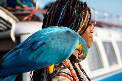 Sadie a rescued B&G macaw with her forever mom on an adventure!